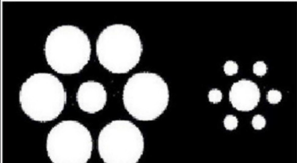 看一下這張圖片。有些人說中間那兩個圓一樣大,有些人說它們有大小的差別。我覺得這兩個圓的大小有差別,你們覺得呢?(同學說有差別。)